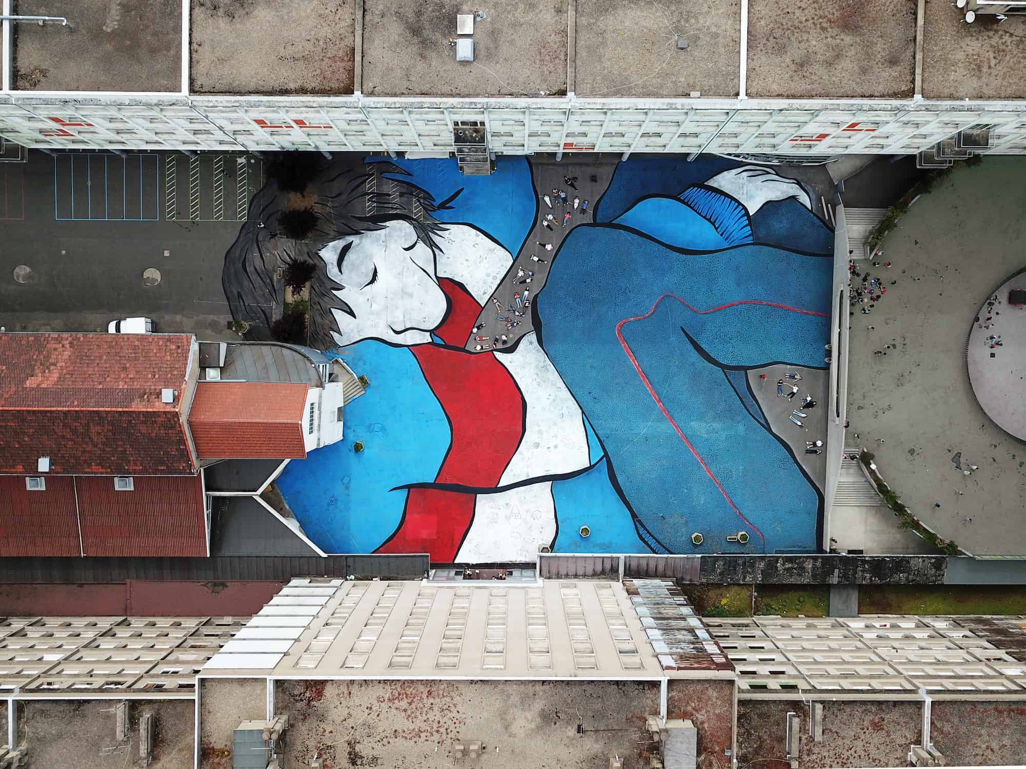 This French pair paints massive murals of sleeping characters on building façades, geometrical lots, and rooftops.